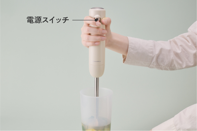 [ブレンダー]を液面より下に沈める、または食材にしっかりつけた状態で【電源スイッチ】を押します。