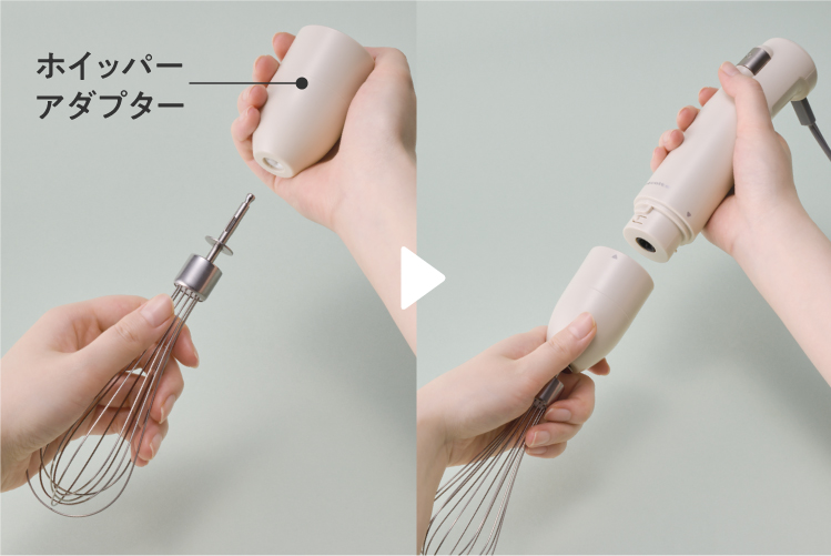 [ホイッパー]をホイッパーアダプターに取り付けて、[本体]にセットします。