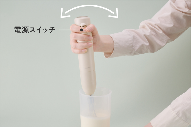 [ホイッパー]を液面より下に沈めた状態で【電源スイッチ】を押し、前後左右に動かしながら仕上げます。