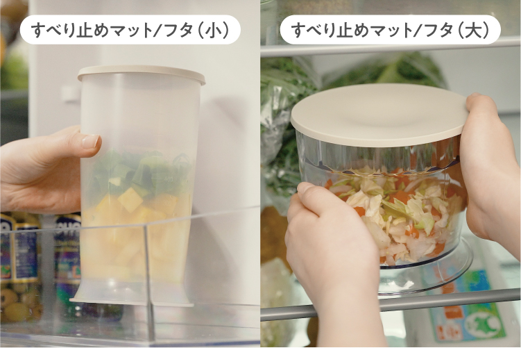 [すべり止めマット/フタ(大)]、[すべり止めマット/フタ(小)]はフタとして、撹拌前または撹拌後の食材を、一時的に保管するときに使用します。