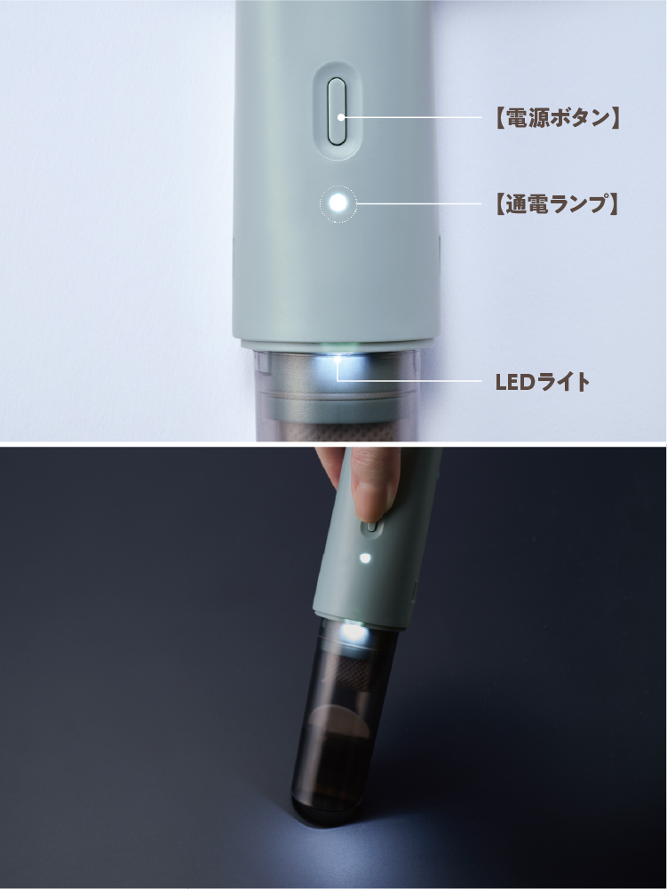 【通電ランプ】が白に点灯し、LEDライトが点灯します。再度押すと電源がOFFになり動作を停止します。