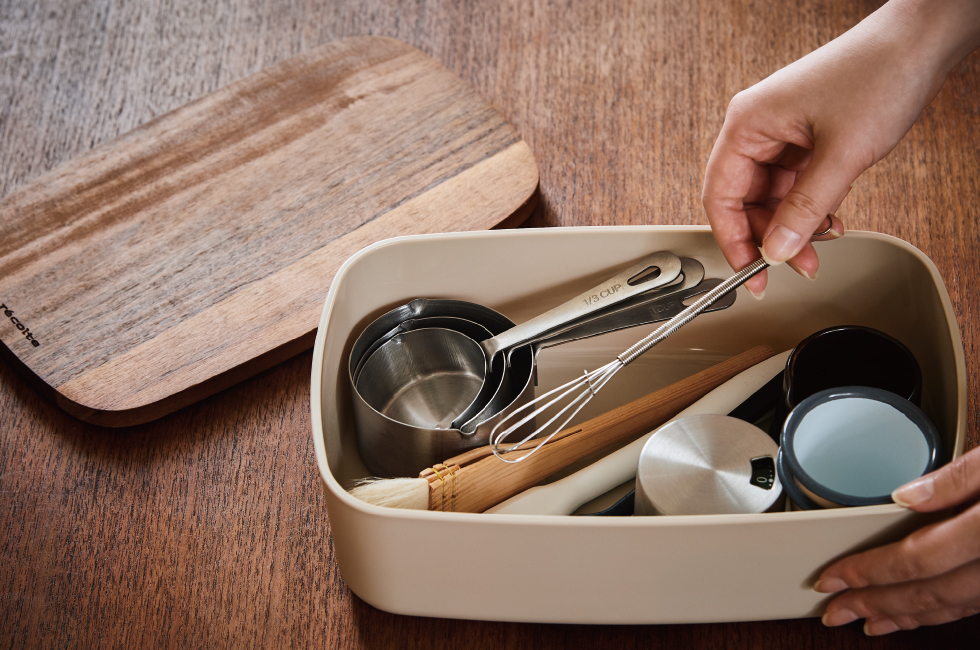 シンプルで飽きのこないデザインなので、キッチンやリビングの細々したツールの収納に使っても◎。