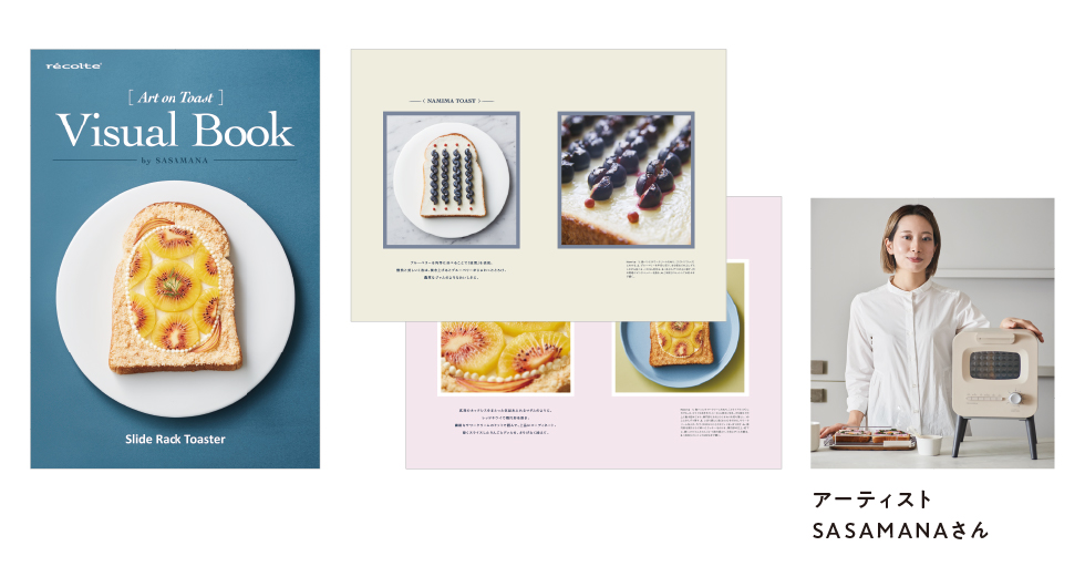 アーティスト・SASAMANAさんが手がける作品「Art on Toast」とレコルト[スライドラックトースター]がコラボレーション。スペシャル付属の[ビジュアルブック]では、美しいトーストとその作り方を紹介しています。