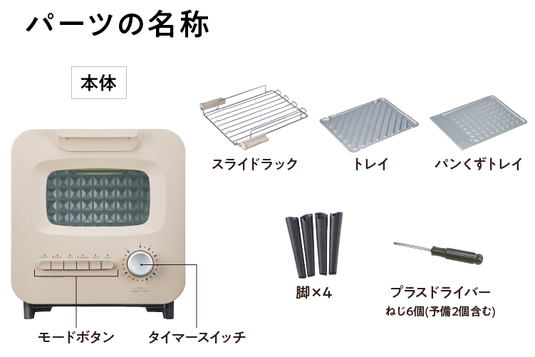 [スライドラック]・[トレイ]・[脚]・[パンくずトレイ]