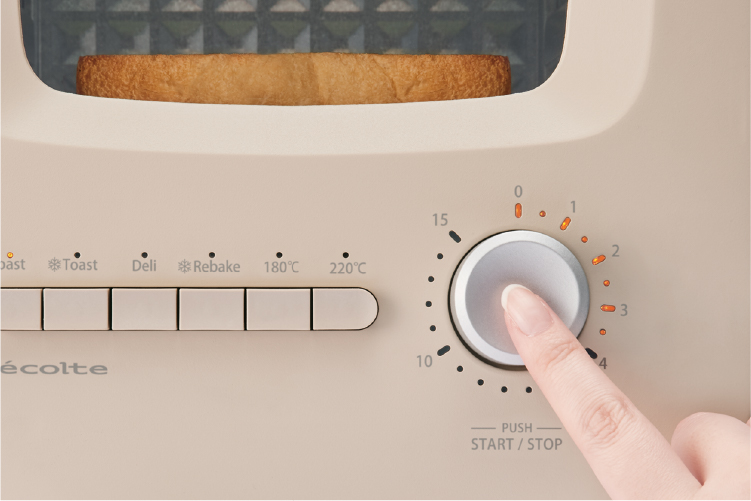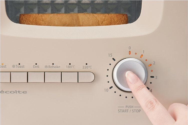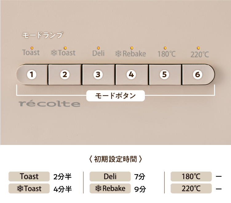 初期設定から焼き時間を変更して記憶させておくこともできるので、各モードボタンと【タイマースイッチ】の2カ所を押すだけで、自分好みの焼き上がりに。忙しい朝などに便利(【180℃】、【220℃】モード以外)。