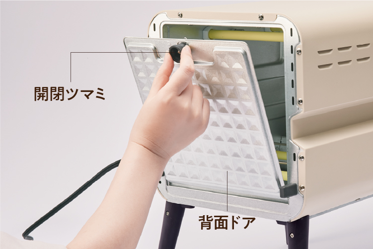 [本体]の背面ドアが大きく開くので、庫内に手を入れやすく、使用後の汚れをすみずみまで拭き取れます。