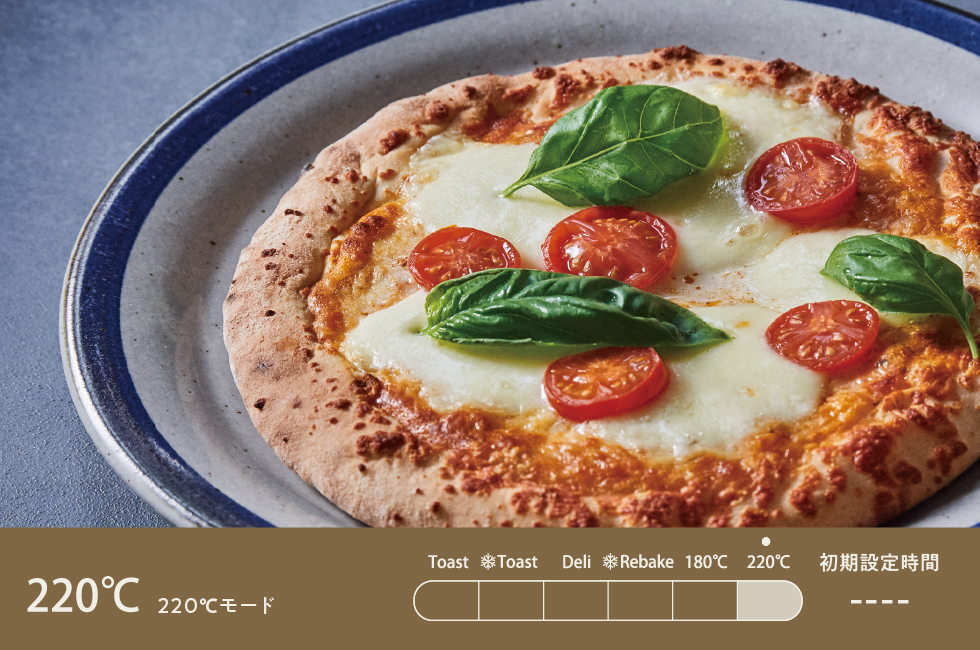 最高温度の【220℃】モード。冷凍ピザやグラタン、もちなどを焼くときに。