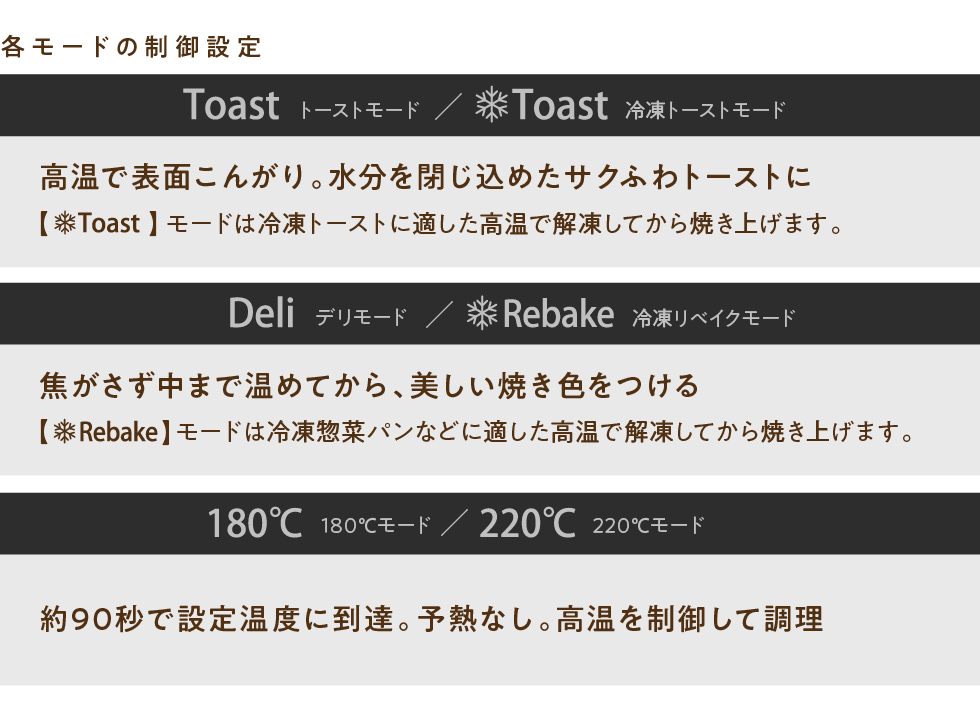 トースターとして普段使いに便利な6モードを搭載。各モードはボタンを押して選択できます。マイコンによる温度と時間の自動制御で、食パン、冷凍パン、惣菜パンなど、それぞれ最適な焼き上がりを手軽に実現します(【180℃】、【220℃】モードは、焼き時間をタイマースイッチで設定)。