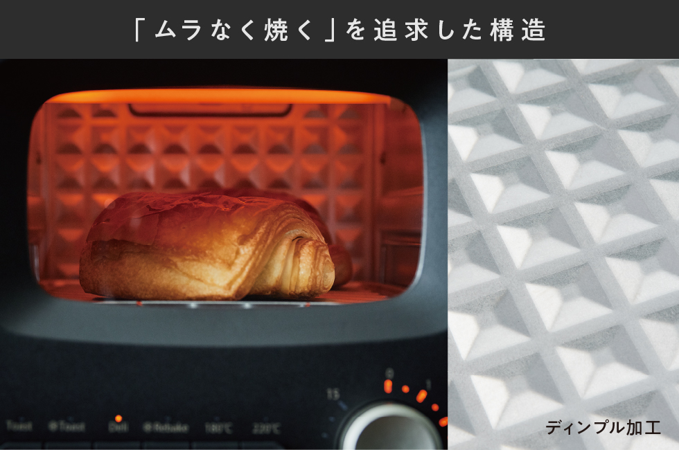 上下4本の遠赤外線ヒーターと、庫内に施したディンプル加工で、熱を反射・拡散。庫内の熱を効率よく循環させて、トーストをムラなくおいしく焼き上げます。
