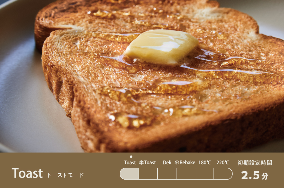 パンの表面を高温でカリッと、きれいなきつね色に焼き上げるためのモード。トーストはもちろん、のせたチーズや具材もおいしくこんがり焼けます。