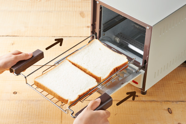 [スライドラック]上にパンなどの調理物を入れ、ドアを閉めます。
