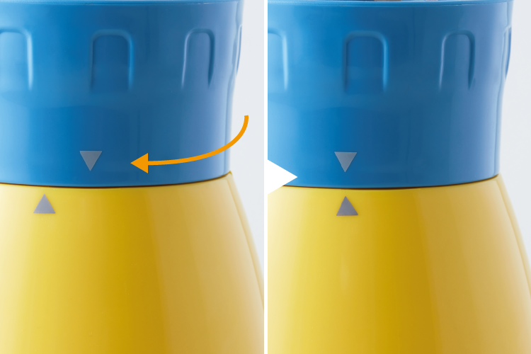 [ボトル]を逆さまにし、[本体]にセットします。[カッター]の▼印と[本体]の▲印の位置が合うよう右に回し、しっかりとロックしてください。