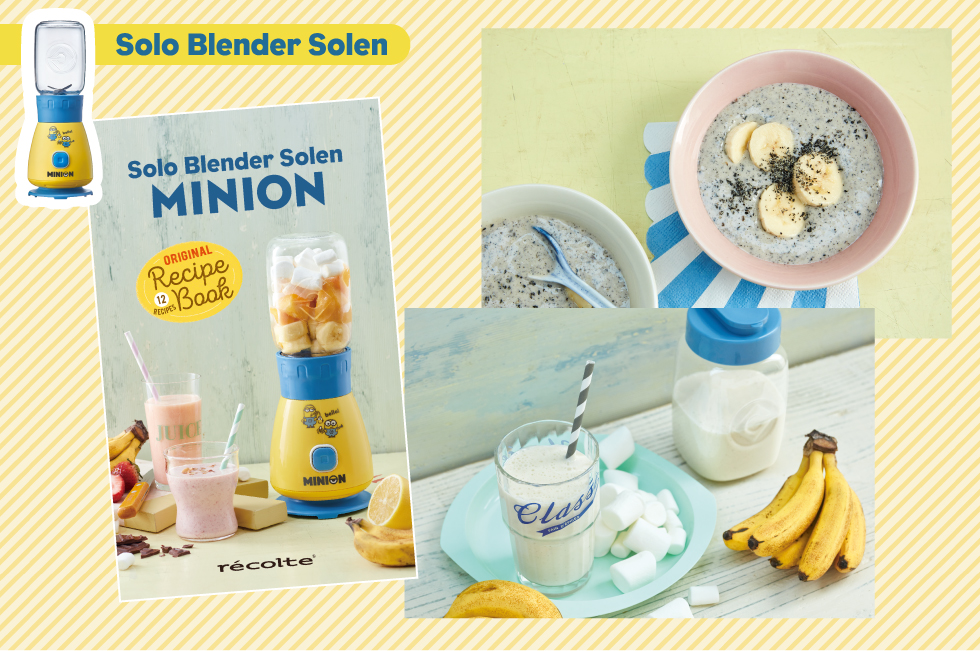 [ソロブレンダーソラン / ミニオン]は、オリジナルのレシピ付き!ミニオンが大好きなバナナをたくさん使ったレシピも含め、簡単に作れる12レシピを「専用レシピブック」に掲載しています。“お手軽&おいしい”生活を、ミニオンと一緒にスタートしましょう!