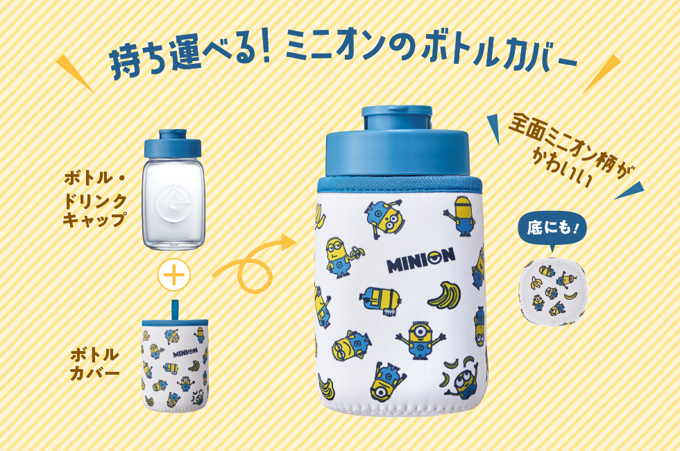 外出する時は、持ち運びに便利な[ボトルカバー]をかぶせて!全面にミニオン柄が入ったデザインで、お出かけもさらに楽しくなるはず。