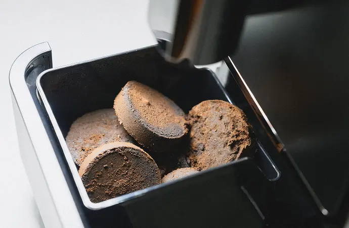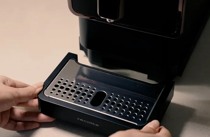 コーヒーは約10杯分のコーヒーカスを溜めることができます。溜まるとごみ捨てサインが表示されますので、カス受けトレイを本体から引き出し捨ててください。