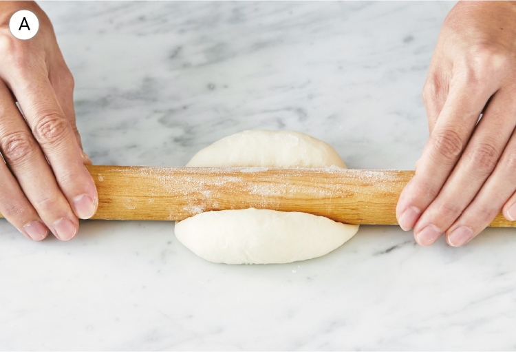 Menu 07 白パン ミルク味のふわふわやわらかい食感が魅力。 やさしい甘さで食事パンとしても。 使用製品 コンパクトベーカリー 製品情報はこちら 材料 5個分 水…130g 強力粉…200g ドライイースト…2.5g 砂糖…15g スキムミルク…8g 塩…3g 無塩バター…12g 強力粉(仕上げ用)…適量 作り方 1 [厚釜パンケース]に水を入れ、次に強力粉を入れる。中央にくぼみを作ってドライイーストをおき、周りに砂糖、スキムミルク、塩、無塩バターをおく。 *水は室温が25℃以上なら5℃の冷水、室温が10℃以下なら30℃のぬるま湯に調温する。 *ドライイーストと塩、水が触れないようにする。 2 [厚釜パンケース]を[本体]にセットして、【Menu】ボタンを押し、【▲・▼】ボタンで【Menu 07(パン生地)】を選んでスタートさせる。一次発酵までおまかせする。 3 パン生地ができあがったらすぐに取り出し、手で押さえてガスを抜く。生地を5等分にして丸め、とじ目をとじる。オーブンシートをかぶせて10分休ませる。 4 再び生地のガスを抜き、丸め直す。上から押して少し平らにし、強力粉(分量外)をつけためん棒で生地の真ん中を強めに押す【POINT写真Ⓐ】。残りの生地も同様にし、オーブンシートを敷いた天板に並べる。 5 霧吹きをしてあたたかい場所(35℃)で35~40分発酵させる。発酵が終わる時間に合わせてオーブンを180℃に予熱しておく。生地がひと回り大きくなれば二次発酵は完了。 6 生地の表面に強力粉(仕上げ用)をふる。180℃に予熱したオーブンを160℃に下げて13分程度、焼き色がつかないように焼く。 【 手順④のPOINT 】 ★白パンの成形方法 写真を参照して成形します。