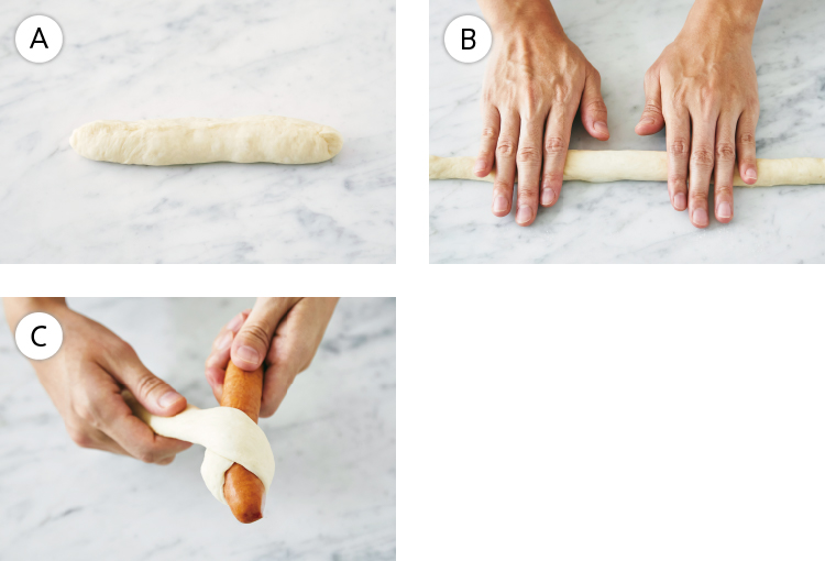Menu 07 ウインナードーナツ さくさくモチモチの生地は焼いたパンとはひと味違う美味しさ。 1個でも食べ応え満点です。 使用製品 コンパクトベーカリー 製品情報はこちら 材料 5個分 水…110g 溶き卵…20g 強力粉…200g ドライイースト…2.5g 砂糖…15g 塩…3g 無塩バター…20g 溶き卵、パン粉、揚げ油…適量 ロングウインナー(長さ約15cm)…5本 作り方 1 [厚釜パンケース]に水、溶き卵を入れ、次に強力粉を入れる。中央にくぼみを作ってドライイーストをおき、周りに砂糖、塩、無塩バターをおく。 *水は室温が25℃以上なら5℃の冷水、室温が10℃以下なら30℃のぬるま湯に調温する。 *ドライイーストと塩、水分が触れないようにする。 2 [厚釜パンケース]を[本体]にセットして、【Menu】ボタンを押し、【▲・▼】ボタンで【Menu 07(パン生地)】を選んでスタートさせる。一次発酵までおまかせする。 3 生地ができあがったらすぐに取り出し、手で押さえてガスを抜く。生地を5等分にし、約15cmの棒状にしてとじ目をとじる。オーブンシートをかぶせて10分休ませる。 4 再び生地のガスを抜き、めん棒で楕円形に広げる。手前から生地を巻いてとじ目をとじ、棒状にする【POINT写真Ⓐ】。手で生地を転がして約35cmの長さにする【POINT写真Ⓑ】。伸ばした生地をウインナーに巻き付ける【POINT写真Ⓒ】。巻き始めと巻き終わりが生地で隠れるように巻く。残りの生地も同様にし、溶き卵を塗り、パン粉をつけたら、巻き終わりが下にくるようにバットに並べる。 5 あたたかい場所(35℃)で35~40分発酵させる。生地がひと回り大きくなれば二次発酵は完了。 6 180℃の揚げ油で片面ずつ揚げる。2~3分揚げて、生地の両面がきつね色になったら取り出して油をきる。 【 手順④のPOINT 】 ★ウインナードーナツの成形方法 写真を参照して成形します。