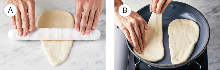 Menu 08 ナン カレーでおなじみのインド料理。 フライパンで本格的なナンがお手軽に。 使用製品 コンパクトベーカリー 製品情報はこちら 材料 小さめ4枚分 水…70g ヨーグルト…60g サラダオイル…12g(大さじ1) 強力粉…200g ドライイースト…2g 砂糖…10g 塩…3g 作り方 1 [厚釜パンケース]に水、ヨーグルト、サラダオイルを入れ、次に強力粉を入れる。中央にくぼみを作ってドライイーストをおき、周りに砂糖、塩をおく。 *水は室温が25℃以上なら5℃の冷水、室温が10℃以下なら30℃のぬるま湯に調温する。 *ドライイーストと塩、水分が触れないようにする。 2 [厚釜パンケース]を[本体]にセットして、【Menu】ボタンを押し、【▲・▼】ボタンで【Menu 08(ピザ生地)】を選んでスタートさせる。発酵までおまかせする。 3 生地ができあがったらすぐに取り出し、手で押さえてガスを抜く。生地を4等分にして丸め、とじ目をとじる。オーブンシートをかぶせて15分休ませる。 4 再び生地のガスを抜く。めん棒で約20cmのしずく形に伸ばす【POINT写真Ⓐ】。同様に他の3枚も成形してオーブンシートをかぶせる。 5 フライパンで2枚ずつ焼く。生地を引っ張りながらフライパンにおいて形をととのえ【POINT写真Ⓑ】、中弱火で片面3~4分ずつ焼く。 【 手順④⑤のPOINT 】 ★ナンの成形方法 写真を参照して成形します。