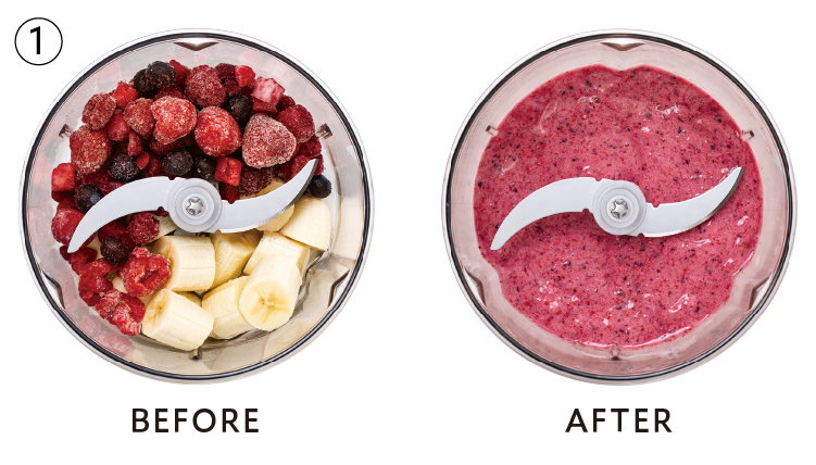 たっぷりベリーとバナナのスムージーボウル アサイーボウルのような見た目のベリーとバナナのスムージー。 グラノーラやヨーグルトに添えて、朝のエネルギーチャージに。 使用製品 フードプロセッサー コンボ 製品情報はこちら 材料 約4人分 【A】冷凍ミックスベリー…200g 【A】バナナ…2本(160g) 【A】はちみつ…大さじ4 ギリシャヨーグルト、グラノーラ、ナッツなど…各適量 準備 バナナは皮をむき、3~4cm程度に切る。 作り方 1 [クリアボウル]に[ブレード]をセットする。 【A】を入れ、なめらかになるまで20秒ほど連続プッシュする〈POINT写真①〉。 2 器に①、ギリシャヨーグルト、グラノーラを盛る。 〈 POINT 〉 写真は撹拌の目安です。 作り方①:撹拌前・撹拌後。