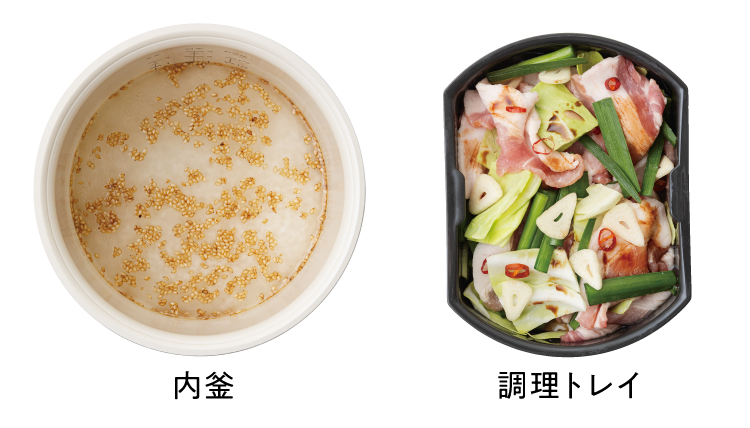 写真は[内釜]と[調理トレイ]にそれぞれ材料を入れた、加熱前の状態です。