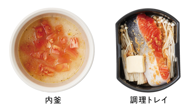 写真は[内釜]と[調理トレイ]にそれぞれ材料を入れた、加熱前の状態です。