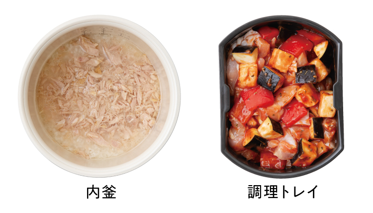 ツナごはん&おかずラタトゥイユ 缶詰のツナを使った手軽にできる炊き込みごはんは、 簡単ラタトゥイユと一緒に 使用製品 クッキングライスクッカー 製品情報はこちら 材料 [内釜]ツナごはん 1合分 米…1合 ツナ(缶詰・オイル)…1缶(70g) 塩…ひとつまみ トッピング イタリアンパセリ(みじん切り) 材料 [調理トレイ]おかずラタトゥイユ 約1人分 鶏もも肉…1/2枚(120g) なす…1本(50g) パプリカ…1/4個(25g) トマトケチャップ…大さじ4 にんにく(すりおろす)、乾燥バジル…各小さじ1/2 下準備 ・鶏肉、なす、パプリカは1.5cmの角切りにする。 作り方 1 ツナごはん : [内釜]に洗った米、ツナ(汁ごと)、塩を入れ、水(分量外)を白米1の目盛まで加え、ひと混ぜする。 2 おかずラタトゥイユ : 材料を全て混ぜ、[調理トレイ]に入れる。 3 [内釜]に[調理トレイ]をのせ、[本体]にセット。 【Menu】で白米を選択 。【START】を押して調理開始 (できあがりまで約35分)。 4 [調理トレイ]を取り出し、軽く混ぜる。 炊き上がったごはんは、さっくり混ぜる。 器に盛りつけ、《トッピング》はお好みで。 〈 POINT 〉 写真は[内釜]と[調理トレイ]にそれぞれ材料を入れた、加熱前の状態です。