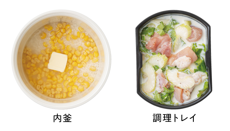 写真は[内釜]と[調理トレイ]にそれぞれ材料を入れた、加熱前の状態です。