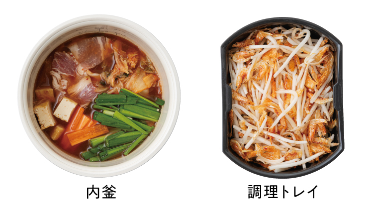 写真は[内釜]と[調理トレイ]にそれぞれ材料を入れた、加熱前の状態です。