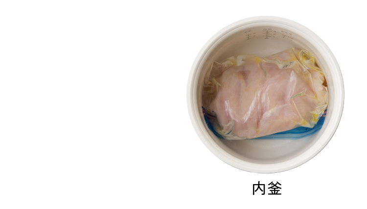 やわらかサラダチキン オイルでコーティングしてしっとり 使用製品 クッキングライスクッカー 製品情報はこちら 材料 作りやすい分量 鶏むね肉…1枚(250g) 塩、砂糖…各小さじ1/4 酒…大さじ1 オリーブオイル…小さじ1 下準備 ・鶏肉はチャック付き保存袋に入れ、塩と砂糖をもみ込む。酒、オリーブオイルを入れてさらにもみ込み、空気をなるべく抜いて封をする。冷蔵庫で1時間ほど漬ける。 *低温調理で使用する保存袋は新しく、きれいなものを使用してください。 作り方 1 保存袋に入れた鶏肉を室温に戻す。[内釜]に入れ、熱湯(分量外)を白米3の目盛まで加える。 2 [内釜]を[本体]にセット。 【Menu】で 低温調理を選択。【時:分】で0:50に設定。【START】を押して調理開始 (できあがりまで約50分)。 3 できあがった鶏肉は氷水で冷やす。スライスし、器に盛りつける。 〈 POINT 〉 写真は[内釜]に材料を入れた、加熱前の状態です。