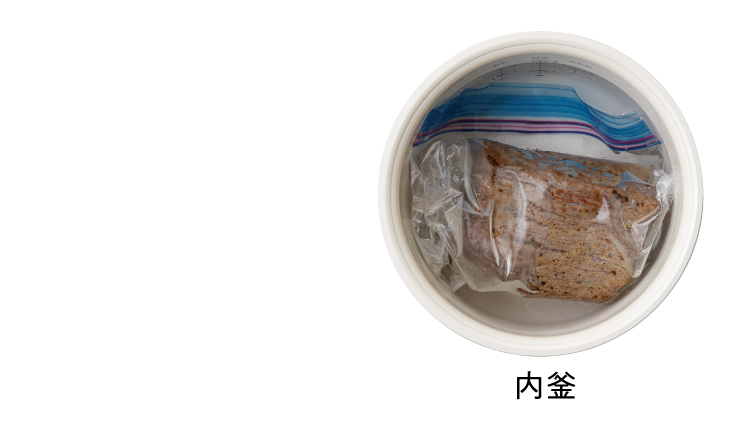 ローストビーフ 低温調理でやわらかく 使用製品 クッキングライスクッカー 製品情報はこちら 材料 作りやすい分量 牛もも肉(ブロック)…300g 塩、黒こしょう…各小さじ1/4 にんにく(すりおろす)…小さじ1 油…小さじ2 シーザードレッシング マヨネーズ…大さじ2 粉チーズ…小さじ1 にんにく(すりおろす)…小さじ1/4 黒こしょう…少々 下準備 ・牛肉は常温に戻す。塩、黒こしょうをふり、にんにくともみ込む。フライパンに油をひき、牛肉を全体に焼き色がつくまで中火で焼く。チャック付き保存袋に入れ、空気をなるべく抜いて封をする。 *低温調理で使用する保存袋は新しく、きれいなものを使用してください。 作り方 1 保存袋に入れた牛肉を[内釜]に入れ、50℃〜65℃程度の湯(分量外)を白米3の目盛まで加える。 2 [内釜]を[本体]にセット。 【Menu】で低温調理を選択。【時:分】で1:00に設定。【START】を押して調理開始 (できあがりまで約1時間)。 3 できあがった牛肉をスライスする。器に盛りつけ、混ぜ合わせた《シーザードレッシング》を添える。 〈 POINT 〉 写真は[内釜]に材料を入れた、加熱前の状態です。