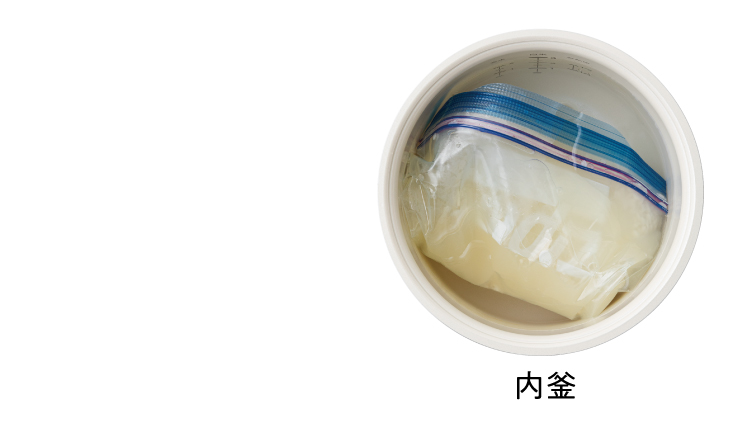 自家製甘酒 麹100%。シンプルな手順で 使用製品 クッキングライスクッカー 製品情報はこちら 材料 作りやすい分量(できあがり約550ml) 乾燥麹…200g 湯(60℃)…450ml 下準備 *チャック付き保存袋に乾燥麹、湯を入れる。空気をなるべく抜いて封をする。 *低温調理で使用する保存袋は新しく、きれいなものを使用してください。 作り方 1 保存袋に入れた乾燥麹と湯を[内釜]に入れ、50〜60℃程度の湯(分量外)を白米3の目盛まで加える。 2 [内釜]を[本体]にセット。 【Menu】で 低温調理を選択。【時:分】で7:00に設定。【START】を押して調理開始 (できあがりまで約7時間)。 3 できあがったら軽く混ぜる。 〈 POINT 〉 写真は[内釜]に材料を入れた、加熱前の状態です。
