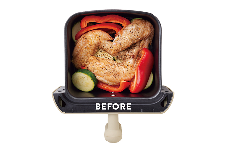 手羽先と野菜のオーブン焼き 皮をパリパリに焼いた手羽先はおかわりしたくなる味。 野菜を下にしいて旨みを吸わせて。 使用製品 エアーオーブン ミニ 製品情報はこちら 材料 1回分 鶏手羽先…3本 【A】しょうゆ…大さじ1 【A】にんにく(すりおろし)、砂糖…各小さじ2 黒こしょう(粗びき)…適量 お好みの野菜(ズッキーニ1/2本・輪切り、赤パプリカ1/2個・4等分など) 作り方 1 ポリ袋などに鶏肉と【A】を入れてもみ、20分おく。 2 [バスケット]に野菜をしき、皮目を上にした①をのせて、黒こしょうをふる。 [本体]にセットして15分加熱する。 〈 POINT 〉 写真は[バスケット]に材料を入れた、加熱前の状態です。