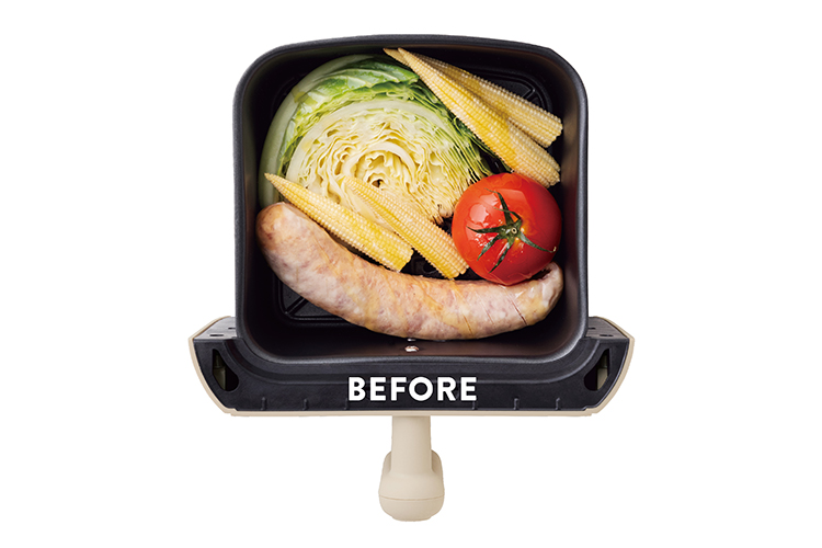 ソーセージと野菜のグリル 大胆に焼いただけでも、ごちそう級の「映え」プレートをおつまみに。 使用製品 エアーオーブン ミニ 製品情報はこちら 材料 1回分 ソーセージ…1〜2本 キャベツ…高さ4cm以下のくし切り ミディトマト…1個 ヤングコーン…4本 オリーブオイル…大さじ1 塩…適量 トッピング 黒こしょう(粗びき)、マスタード 作り方 1 ソーセージは斜めに切り込みを入れる。 2 [バスケット]に①、野菜を並べ入れる。オリーブオイルを回しかけて、塩をふる。 [本体]にセットして15分加熱する。 3 焼き上がったら、〈トッピング〉はお好みで。 〈 POINT 〉 写真は[バスケット]に材料を入れた、加熱前の状態です。