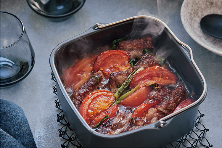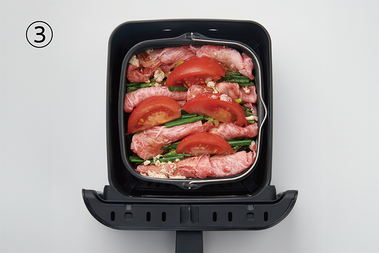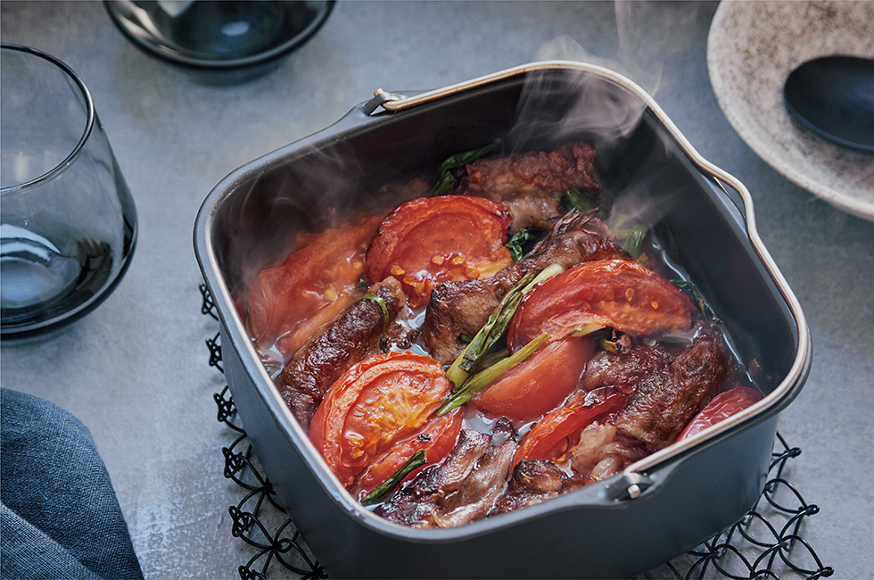トマトすき煮 [インナーポット]を使えば、煮込みもOK。 定番料理にトマトを入れて変化を与えて。トマトの酸味が甘辛煮汁にマッチします。 使用製品 ハイスチームエアーオーブン 製品情報はこちら 材料 約2人分 牛薄切り肉(すき焼き用、大きければ半分に切る)…150g トマト(くし切り)…2個 小ねぎ(3~5cm長さに切る)…1束 【A】砂糖…大さじ1 【A】しょうゆ…大さじ1と1/2 【A】酒、みりん…各大さじ1 作り方 1 [インナーポット]にトマトを並べ入れる。隙間に小ねぎ、牛肉を入れる。 2 【A】の調味料は混ぜずに砂糖から順番に①へかける。 3 [バスケット]の[内アミ]の上に②をのせ、[本体]にセットする〈POINT写真③〉。 4 【Air Oven】モードで、180℃/12〜15分加熱する。 〈 POINT 〉 作り方③:[バスケット]に入れた、加熱前の状態です。