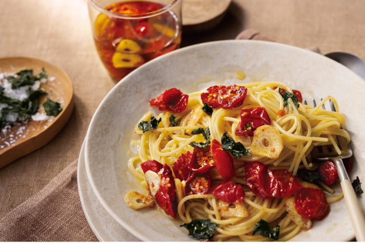 ドライトマトのオイル漬け 乾燥することでトマトがより甘く、濃厚に。オイルに漬ければ料理に幅広く使えます。 冷蔵庫で2週間ほど保存できます。 使用製品 ドライフード&ヨーグルトメーカー 製品情報はこちら 材料 作りやすい分量作り置きのドライ食材を使用する場合は【ドライ後】の分量で調整してください。 ★ミニトマト(半分に切る)…20個【ドライ後…40g】 ★にんにく(5mm厚さの薄切り)…2かけ【ドライ後…4g】 【A】オリーブオイル…100ml 【A】塩…小さじ1/2 乾燥時間と温度 [棚アミ]に★の材料を並べ、70℃/8〜9時間ドライする。 作り方 1 保存容器にドライしたミニトマト、にんにくを入れ、【A】を加える。 〈 ARRANGE 〉 ゆでたパスタに和え、バジルソルトをふりかけるだけ。あっという間にお店の味に。