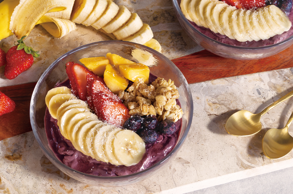 アサイーボウル ひんやり爽やか、混ぜるだけで簡単! 使用製品 コードレスカプセルカッター ボンヌ 製品情報はこちら 材料 1~2人分 【A】冷凍アサイーピューレ (手でひと口大に折る)…100g 【A】バナナ(2〜3cm幅に切って冷凍したもの)…80g 【A】冷凍マンゴー…35g ギリシャヨーグルト(水切りヨーグルト)…65g トッピング お好みのフルーツ(バナナ、いちご、ブルーベリー、マンゴーなど)、グラノーラ、ココナッツファイン、はちみつ…各適量 準備 【A】は作る5分前に冷凍庫から出しておく。 作り方 1 [4枚刃ブレード]をセットした[ガラスカップ]に、トッピング以外の全ての材料を入れる。3~4回パルスプッシュしてから、なめらかになるまで10~20秒長押しする。 *材料が張り付いた場合は[カバー]を開けてスパチュラなどで中央に寄せてください。 2 器に盛り、トッピングはお好みで。
