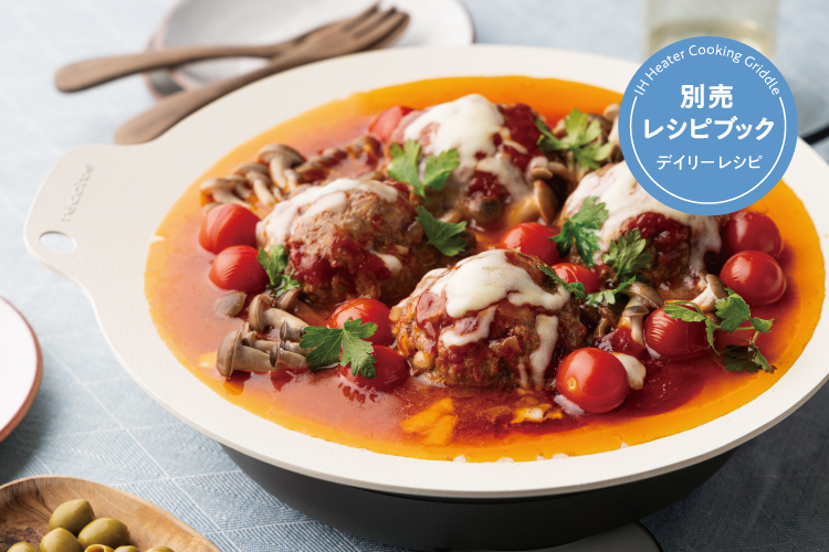 煮込みハンバーグ 蒸し焼きでふっくら。 [専用フタ]をすれば、煮込みはほったらかしでOK。 使用製品 卓上IHクッキンググリドル 製品情報はこちら 使用オプションパーツ 専用フタ 材料 4個分《ハンバーグのたね》 合いびき肉…400g 塩…小さじ1 玉ねぎ…1/2個(100g) 【A】パン粉、牛乳…各大さじ4 【A】卵…1個 【A】黒こしょう(粗びき)…少々 しめじ…1パック ミニトマト…12個 【B】トマトケチャップ…大さじ4 【B】中濃ソース…大さじ2 【B】砂糖…大さじ1/2 ピザ用チーズ…50g トッピング イタリアンパセリ 準備 《ハンバーグのたね》を作る ・玉ねぎはみじん切りにする。 ・ボウルにひき肉、塩を入れ、粘り気が出るまで練る。 ・玉ねぎ、【A】を加え、さらによく混ぜる。4等分にして、それぞれ楕円形にととのえる。 ・しめじは石づきを取ってほぐす。 作り方 1 [グリドル]に《ハンバーグのたね》を並べる 2 【MENU】加熱、【▲・▼】火力【6】〜【4】を選び、【START/STOP】を押す。 3 焼き色がついたら裏返す。しめじ、ミニトマトを隙間に並べる。混ぜ合わせたBをかけ、[専用フタ]をする。火力【4】で10分加熱する。 4 ピザ用チーズをのせ、[専用フタ]をしてチーズが溶けるまでさらに2分加熱する。《トッピング》はお好みで。