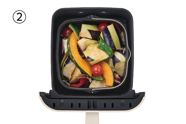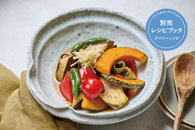 野菜の焼き浸し 【Hi Steam】モードなら食感を損なわず、素材本来の魅力を引き出します。 めんつゆで味が決まるのもうれしいポイントです。 使用製品 ハイスチームエアーオーブン 製品情報はこちら 材料 約2人分 しょうが(せん切り)…1/2かけ 赤パプリカ(ひとくち大の乱切り)…1/2個(70g) なす(皮をピーラーで縞目にむき、1cm幅の輪切り)…2本 ピーマン(乱切り、種は取らなくてもOK)…1個 かぼちゃ(6mm厚さの薄切り、大きい場合は半分の長さに切る)…4枚(70g) ミニトマト…4個 ごま油…大さじ1/2 めんつゆ(2倍濃縮)…大さじ4~5 準備 [水タンク]に水を入れる。 作り方 1 [インナーポット]にしょうがを入れ、赤パプリカ、なす、ピーマン、かぼちゃ、ミニトマトをのせる。 ごま油を加えて混ぜ、めんつゆをかける。 2 [バスケット]の[内アミ]の上に①をのせ、[本体]にセットする〈POINT写真②〉。 3 【Hi Steam】モードで、170℃/12~15分加熱する。 4 加熱後ひと混ぜし、10分以上おいて味をなじませる。 *焼き上がってから少し時間をおくと味がよくしみ込みます。 〈 POINT 〉 作り方②:[バスケット]に入れた、加熱前の状態です。