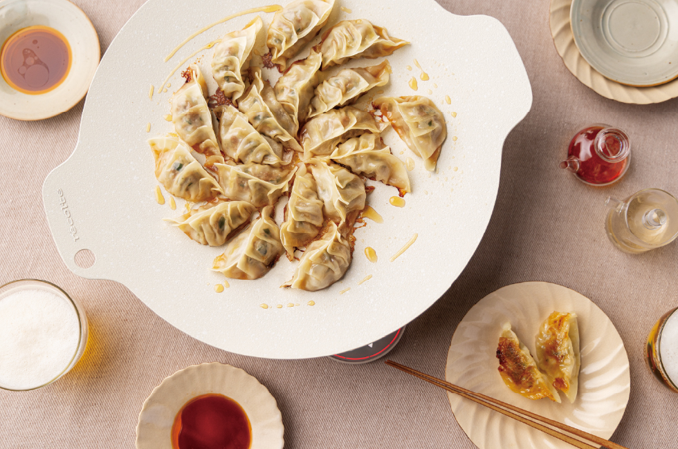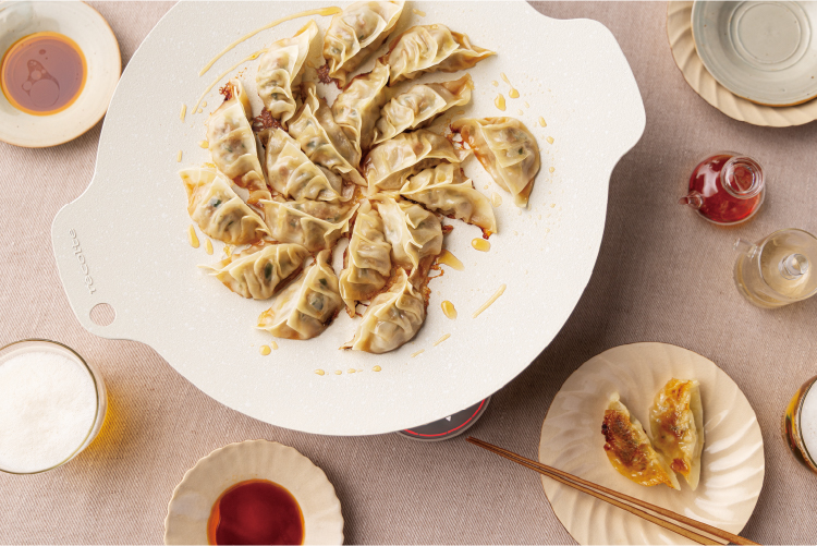 基本の餃子 ジュワッと肉汁!卓上で焼き上げる餃子は映えも◎ 使用製品 卓上IHクッキンググリドル 製品情報はこちら 使用オプションパーツ 卓上IHクッキンググリドル専用フタ 材料 20個分 餃子の皮…20枚 《餃子のたね》 豚ひき肉…200g キャベツ…100g にら…1/2束(50g) 塩…小さじ1/3 【A】しょうゆ、酒、ごま油…各大さじ1 【A】鶏がらスープの素(顆粒)、砂糖…各小さじ1 【A】にんにく(すりおろす)…ひとかけ分 ごま油…大さじ2 【B】水…80ml 【B】片栗粉…小さじ1 たれ しょうゆ、酢、ラー油 準備 《餃子のたね》を作る ・キャベツは粗みじん切りにして、塩をふってもみ込む。10分おき、水気をきる。にらは1cm幅に切る。 ・ボウルにひき肉、【A】を入れてしっかり練る。 ・キャベツとにらを加えて混ぜる。 餃子の皮1枚のふちに水(分量外)をつけ、1/20量の《餃子のたね》をのせて包む。 残りも同様に作る。 作り方 1 [グリドル]にごま油の半量をひき、少し間隔を空けながら、餃子を放射状に並べる。 2 【MENU】加熱、【▲・▼】火力【6】〜【4】を選び、【START/STOP】を押す。 3 【B】を混ぜ合わせておく。餃子に焼き色がついたら注ぎ、[専用フタ]をして火力【4】で10分加熱する。 4 [専用フタ]を取って残りのごま油を回し入れ、水分が飛ぶまで焼く。焼き上がったら、お好みで〈たれ〉につけていただく。