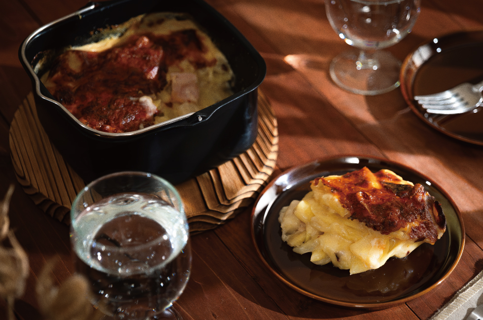 もちもちポテトのチーズ焼き お正月が終わるとつい余ってしまいがちなお餅。 でも、こんな一品が作れるならいつでもお餅を常備しておきたくなります。 使用製品 ハイスチームエアーオーブン 製品情報はこちら 材料 [インナーポット]1回分 じゃがいも(皮をむいて、スライス)…300g 玉ねぎ(薄切り)…1/4個 ベーコン…2枚 切りもち(1cm幅に切る)…2個 薄力粉…大さじ2 コンソメスープの素(顆粒)…大さじ1 こしょう…少々 牛乳…200ml シュレッドチーズ…50g 作り方 1 じゃがいもは皮をむき、スライサーでスライスする。 2 玉ねぎは薄切り、ベーコンは2cm幅、切りもちは1cm幅に切る。 3 ボウルに①と②、薄力粉、顆粒コンソメ、こしょうを入れてよく混ぜる。 4 ③に牛乳を加えてさらに混ぜ、[インナーポット]に入れ、シュレッドチーズをのせる。 5 【Combo】モードで、【【Hi Steam : 160℃/20分】→【Air Oven : 200 ℃/5分】加熱する。