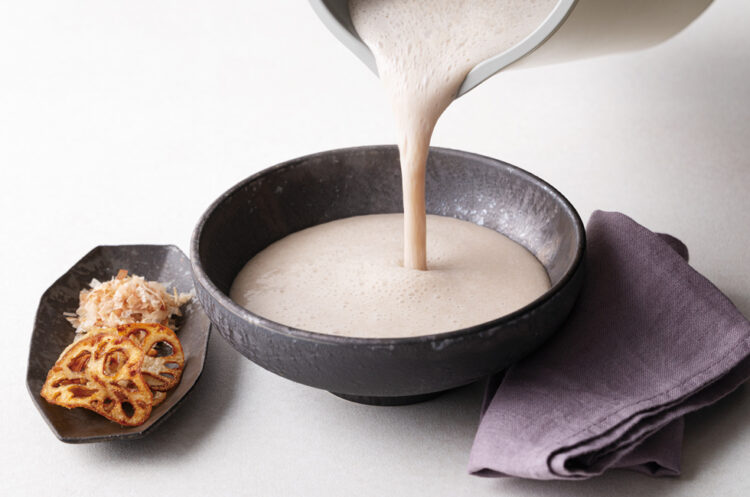 れんこんの和風ポタージュ ほのかなれんこんの甘みと和風だしのやさしさ。 ほっと落ち着く味わいです。 使用製品 自動調理ポット ラージ 製品情報はこちら 材料 4〜5人分 水…200ml 調整豆乳…400ml れんこん(皮をむき、2〜3cm厚さのいちょう切り)…200g 和風だしの素(顆粒)…大さじ1 トッピング れんこんチップス、かつお節 作り方 1 材料を表記の上から順に入れる。 2 【MODE】ボタンをタッチし、 【ポタージュ|ペースト】を選択。 【START|STOP】ボタンで、スタート。 *できあがったら器に注ぎ、トッピングはお好みで。