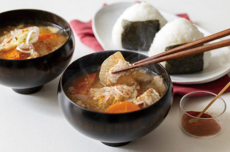 ごろごろ具材の豚汁 野菜と肉の旨みが溶け出す、 だし不要の簡単豚汁。 使用製品 自動調理ポット ラージ 製品情報はこちら 材料 4〜5人分 水…450ml 玉ねぎ(2cm幅に切る)…50g(大1/4個) だいこん(7mm〜1cm厚さのいちょう切り)…100g にんじん(5〜7mm厚さの半月切り)…80g 豚バラ肉(焼肉用、2〜3cm幅に切る)…120g みそ…大さじ2 材料を入れる順番 液体、やわらかいものから入れてください トッピング ねぎ(小口切り)、一味唐辛子 作り方 1 材料を表記の上から順に入れる。 2 【MODE】ボタンをタッチし、 【たべるスープ】を選択。 【START|STOP】ボタンで、スタート。 *できあがったら器に注ぎ、トッピングはお好みで。