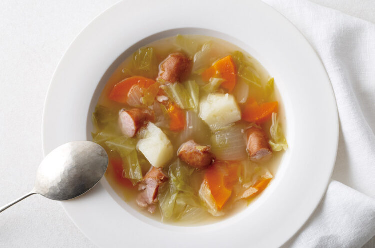 たっぷり野菜のコンソメスープ 野菜の甘みが引き立つ、 ベーシックなコンソメスープ。 使用製品 自動調理ポット ラージ 製品情報はこちら 材料 4〜5人分 水…400ml 玉ねぎ(2cm幅に切る)…100g(大1/2個) じゃがいも(2cm角に切る)…50g キャベツ(3cmのざく切り)…100g にんじん(5mm厚さの半月切り)…50g ソーセージ(2cm幅に切る)…5本(90g) コンソメスープの素(顆粒)…小さじ2 作り方 1 材料を表記の上から順に入れる。 2 【MODE】ボタンをタッチし、 【たべるスープ】を選択。 【START|STOP】ボタンで、スタート。 〈 memo 〉 水と具材の割合を同量にすれば、野菜を変えてアレンジしても。