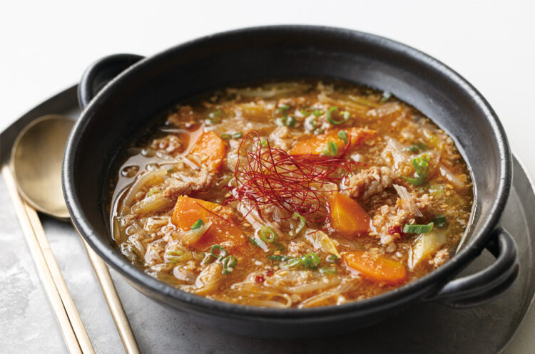 ユッケジャンスープ ピリ辛が食欲をそそる! 仕上げのごま油が香る、食べごたえある韓国風スープ。 使用製品 自動調理ポット ラージ 製品情報はこちら 材料 4〜5人分 水…400ml もやし…50g ねぎ(5mm幅の斜め薄切り)…100g(1本) にんじん(5mm厚さの半月切り)…35g 牛薄切り肉(4cm幅に切る)…130g にんにく、しょうが(共にすりおろし)…各小さじ1/2 しょうゆ…大さじ2 砂糖、コチュジャン…各大さじ1 豆板醤…小さじ1/2 鶏がらスープの素(顆粒)…小さじ1 ごま油(仕上げ用)…小さじ1 トッピング 小ねぎ(小口切り)、糸唐辛子、白すりごま 作り方 1 材料を表記の上から順に入れる。 2 【MODE】ボタンをタッチし、 【たべるスープ】を選択。 【START|STOP】ボタンで、スタート。 *できあがったら器に注ぎ、仕上げ用のごま油を加えてひと混ぜする。 トッピングはお好みで。