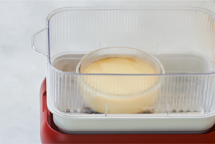 大きなプリン [ホットプレート専用 セラミックスチーム深鍋](別売) ➕[ホットプレート専用 クリアスチーマー](別売)を使用。卵の味がしっかりと感じられる大きなプリン。 使用製品 ホットプレート 製品情報はこちら 使用オプションパーツ 蒸しプレート 使用オプションパーツ セラミックスチーム深鍋 使用オプションパーツ 蒸しアミ 使用オプションパーツ クリアスチーマー 材料 耐熱ガラス型(15cm)1個分 卵…4個 グラニュー糖…60g 牛乳…150ml 生クリーム…200 ml ラム酒…小さじ1 カラメルソース グラニュー糖…50g 水…小さじ1 作り方 1 (下準備)耐熱ガラス型の内側面に、サラダ油を塗っておく。 2 《カラメルソース》を作る。フッ素樹脂コーティングのフライパンにグラニュー糖と水を入れて中火にかけ、カラメル色になるまで焦がしたら、型に流し入れる。 3 ボウルに卵を溶きほぐし、グラニュー糖を入れ、泡立て器で混ぜる。 4 小鍋で牛乳と生クリームを湯気が出る程度に温め、②に入れる。ラム酒を加えてザルでこし、①に静かに注ぎ入れる。 5 [本体]に[セラミックスチーム深鍋]をセットし、水約500ml(分量外)を入れる。[蒸しプレート]をのせ、[フタ]をして【温度調節ダイヤル】を【HI】に合わせ加熱する。 6 蒸気が上がってきたら【温度調節ダイヤル】を【LOW】に近い【WARM】に下げる。 [フタ]をあけ、[蒸しプレート]に③をのせ、[クリアスチーマー]をセットする。[フタ]をして約15分加熱する。 7 【温度調節ダイヤル】を【OFF】に合わせ、[フタ]をしたまま余熱で8〜10分蒸らす。中央まで固まっていたら取り出し粗熱をとる。冷蔵庫で一晩冷やす。 【 POINT 】 ★クリアスチーマーを使えば、高さのある器でも調理できます。