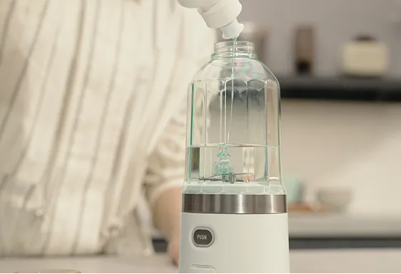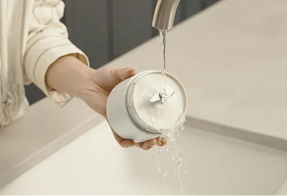 水と台所用中性洗剤を入れて動かすだけで簡単に洗浄できます。生活防水(IPX5相当)なので、ブレード部分を水洗いすることもできます。